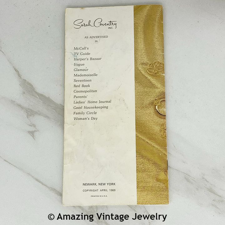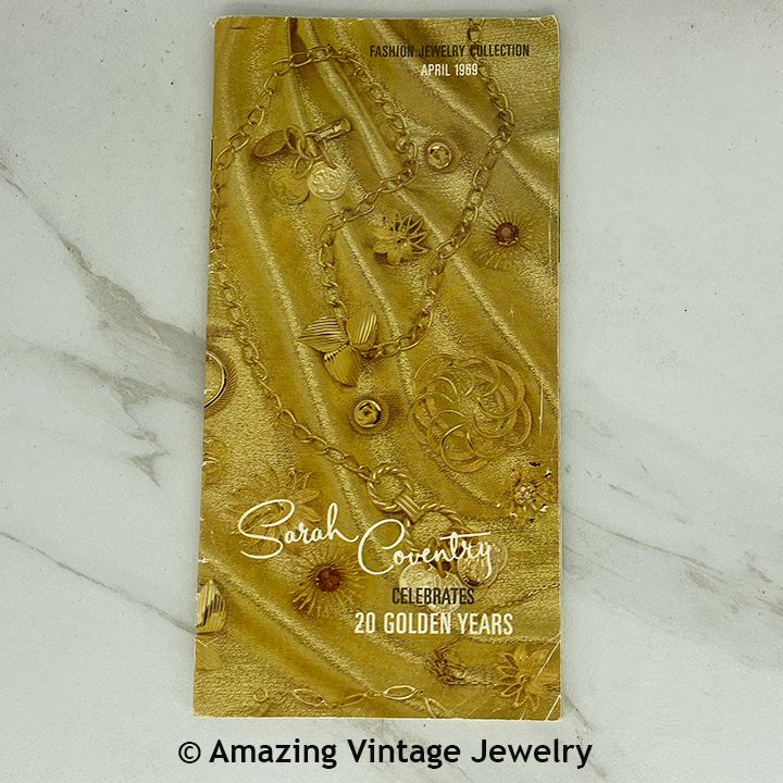 Catalog - Sarah Coventry. April 1969 - Sarah Coventry Celebrates 20 Golden Years. 36 pages. Very good condition with very mild staining on the back cover and extremely minor wear to the corners and edges. No writing that I could find except for the Fashion Show Director's name and address written inside the back cover. The photo is the exact catalog you will receive.