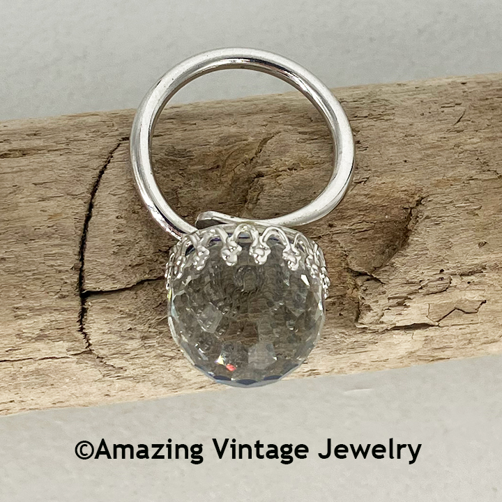Ring - Sarah Coventry. "BERMUDA BLUE" from 1970. Silvertone with a faceted glass marble that reflects like the clear blue bermuda ocean...Colors of blue and green. Filigree silvertone setting. Ring top is about 1/2" in diameter. Adjustable. Very good condition. This is the original version of this ring. Presumably it was redesigned later that year with prongs to better hold the stone instead of the glue set stone in the filigree setting (the new version is called "New Bermuda Blue"). This listing is for the ring shown in the photo - the "BERMUDA BLUE" ring.
