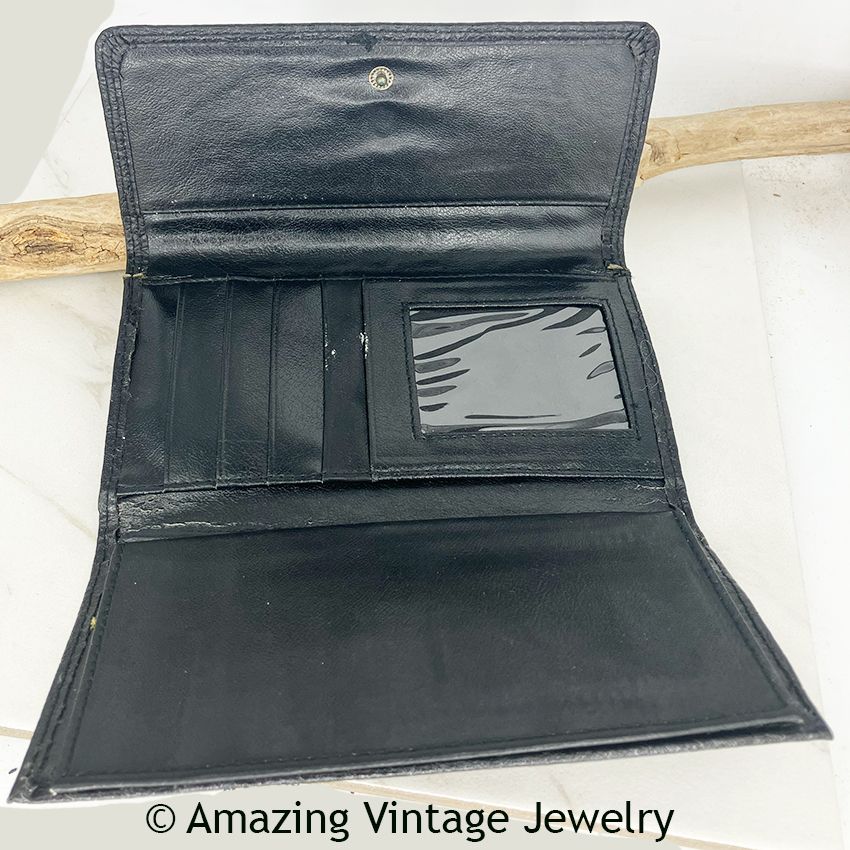 Wallet - Sarah Coventry. Tri-fold genuine split leather wallet for checkbook, credit cards and change. This would be from the 1990's and newer Sarah Coventry line based on the butterly logo on the front. 7 3/8" across, 3 3/4" tall and 1 1/4" thick. Nice and heavy. Leather is in very nice condition. The only minor flaw I see is some mild discoloration to the gold/brass metal of the change purse. Otherwise very good condition.