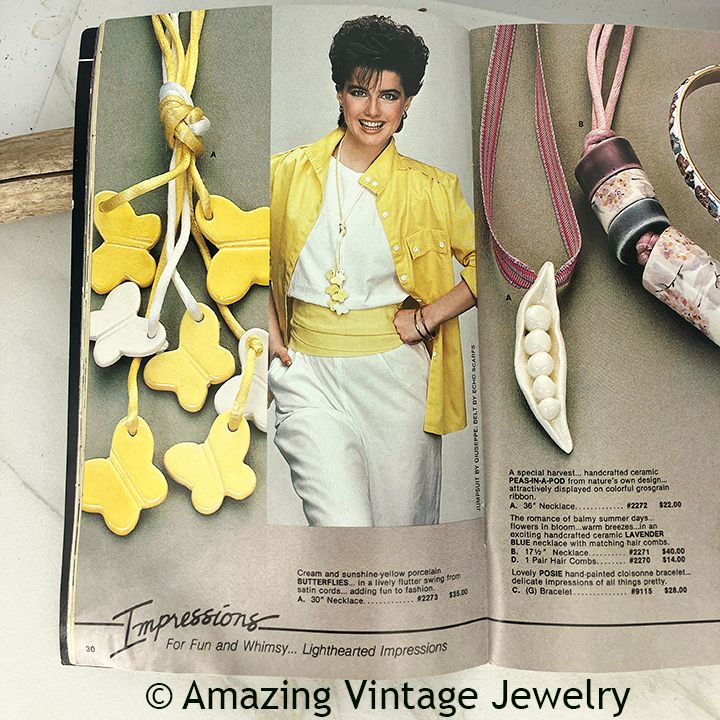 Necklace - Sarah Coventry. "BUTTERFLIES" from 1983. Cream and sunshine-yellow porcelain butterflies on satin cords. 30" long. Very good condition. If you plan to wear this, the cords will need to be steamed, as the are curved from being stored for years. This is a very rare item - it first appears in the 1983 catalog but is not offered in the 1984 catalogs. Second photo is from the 1983 catalog to show how it is worn - catalog not included with the necklace in this listing.