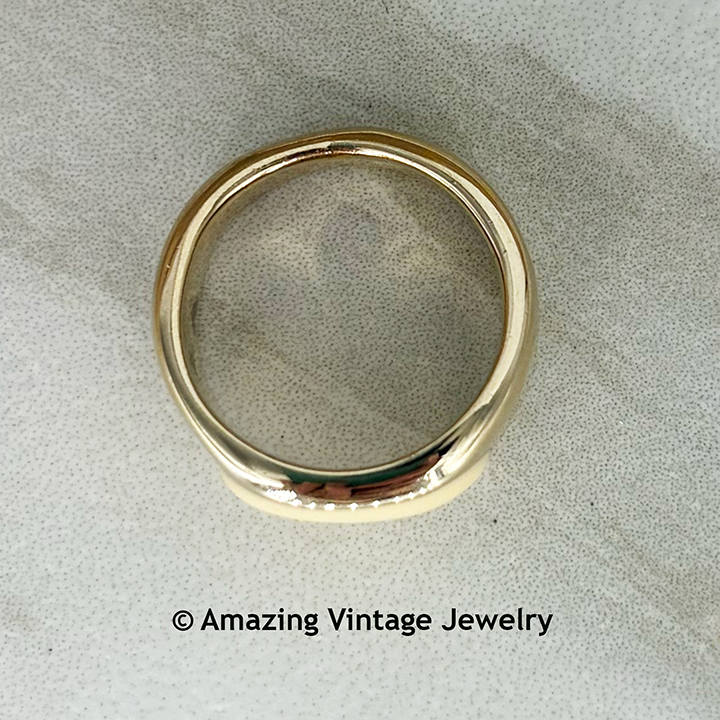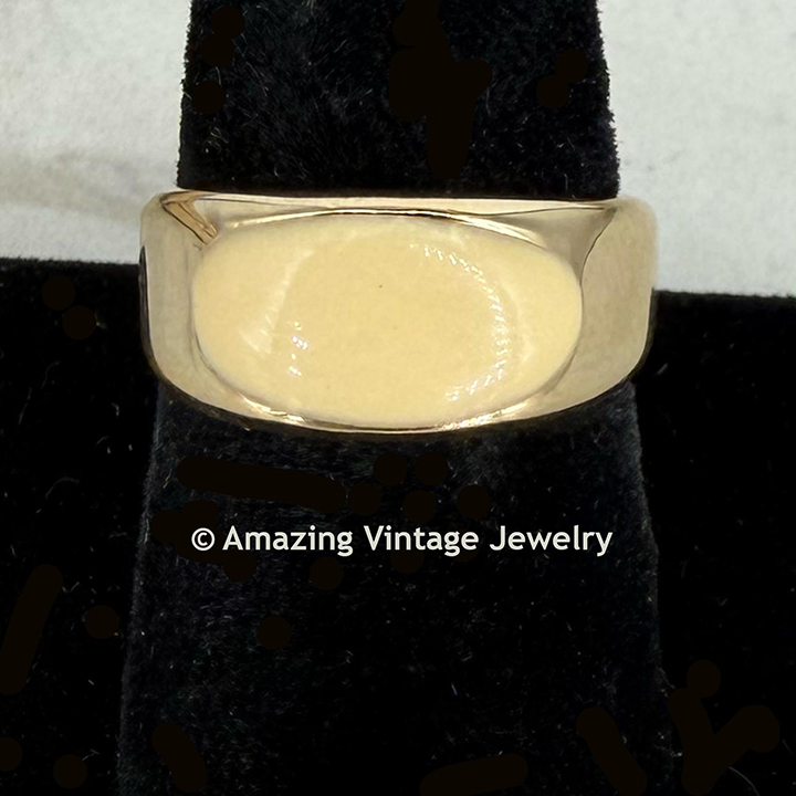 Ring - Sarah Coventry. "CHIFFON" from 1981. Shiny goldtone band with center cream oval enamel inset. 3/8" wide at the widest point. Size 5 - this ring is not adjustable. Very good condition.