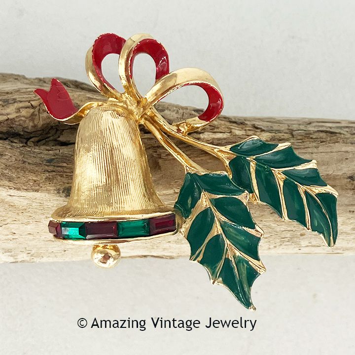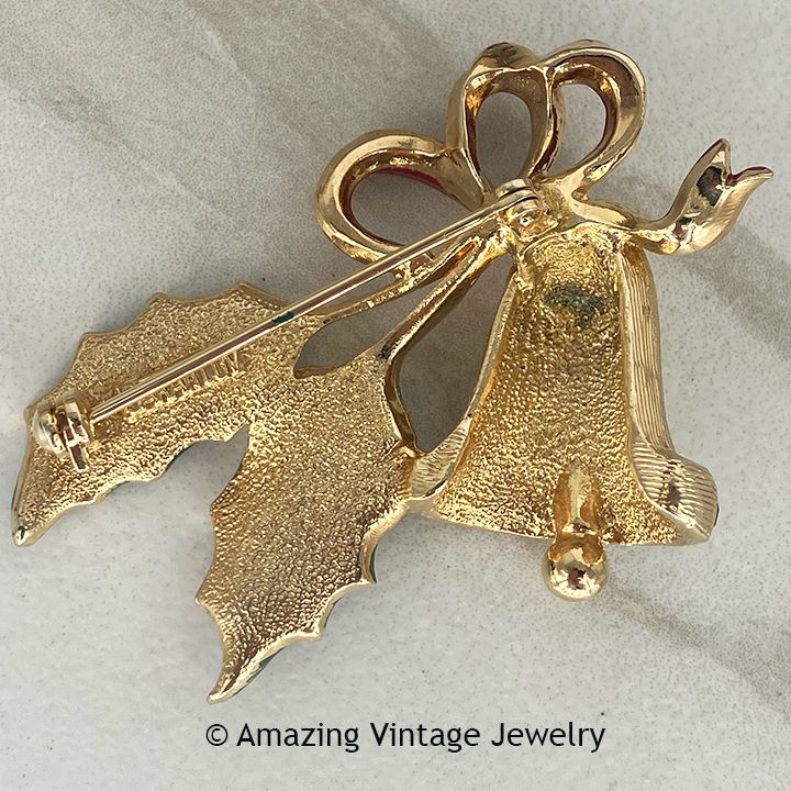 Pin - Sarah Coventry. "HOLLY BELL" from the Lifestyle Brands era. Christmas bell and holly leaves. Heavy textured goldtone with red and green enamel and red and green rhinestones. About 2 1/16" high and 2" across. Very good condition - often found with wear to the enamel but this one looks very good with minimal wear. On the back side in the dome of the bell there is some discoloration - see the photo - it cannot be seen when worn.