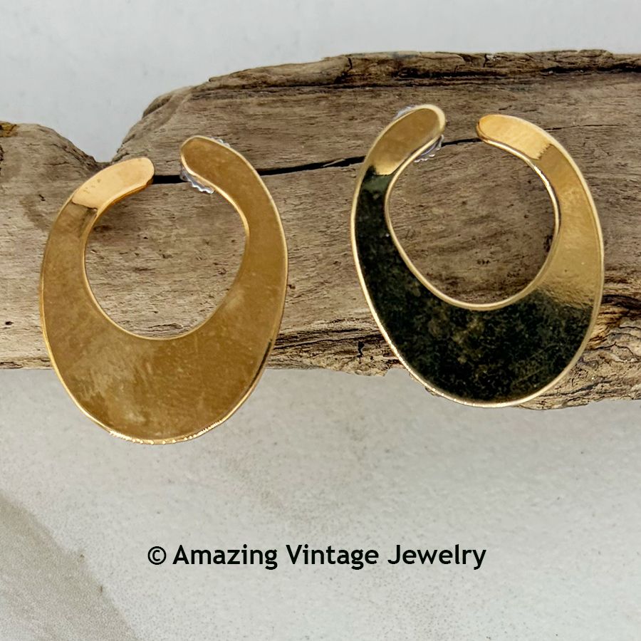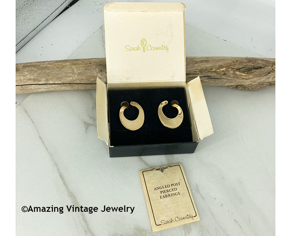 Earrings - SARAH COVENTRY. "DISTINCTION" from 1978. Let's go retro 70's with these shaped goldtone earrings. Pierced. Very good condition in the original box on the original card with the paper insert that came with these originally. Earring finish has some mild discoloration that is hard to see. The photo is the exact pair you will receive.