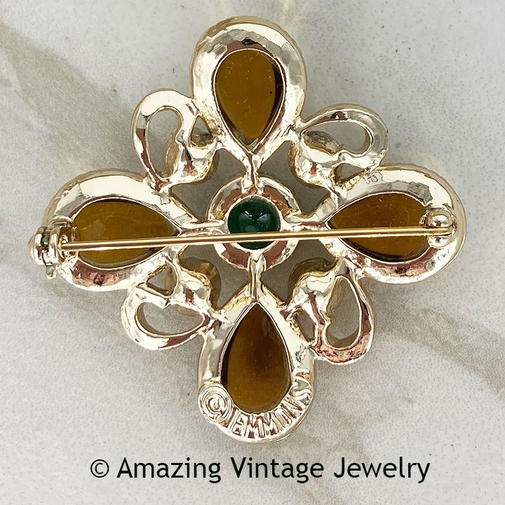Pin - Emmons. "AUTUMN HAZE" is the name given to me by a collector but I cannot verify that. Large, pretty autumn brown and green clear cabochons, accented with faux pearls. Goldtone is bright and shiny! 1 1/2" in diameter. Very good condition.
