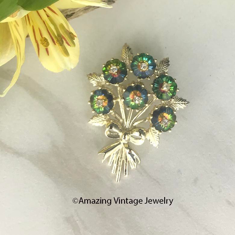 PIN - EMMONS. "GAY MARGUERITA" FROM 1965. GORGEOUS BOUQUET OF WATERMELON STONE FLOWERS, SET IN GOLDTONE, WITH RHINESTONE CENTERS. JUST STUNNING! ALMOST 2" LONG, 1 9/16" ACROSS. VERY GOOD CONDITION.