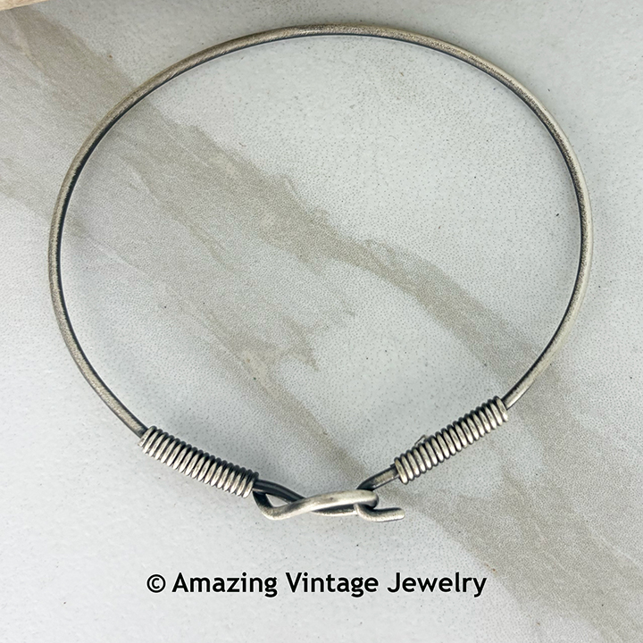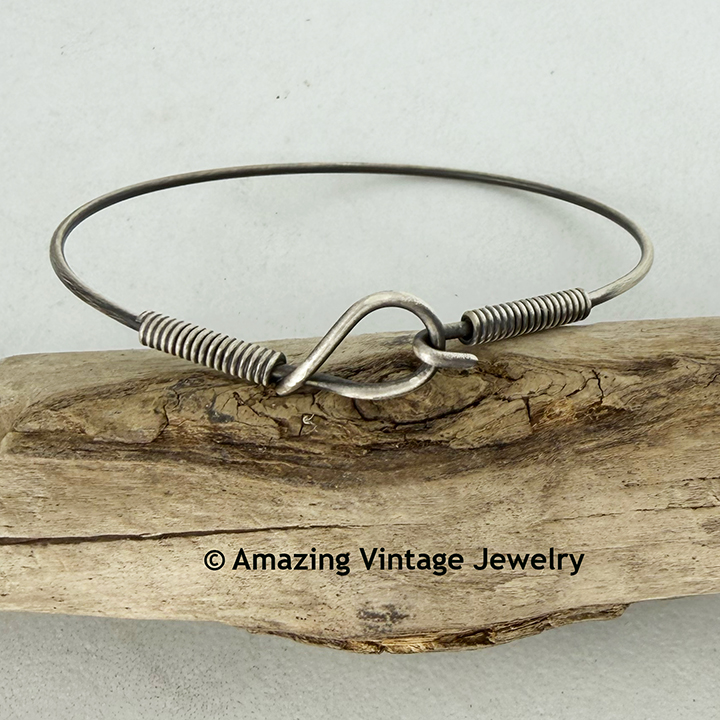 Bracelet - Sarah Coventry. "EXPLORER" from the Men's line of 1975. Thick oxidized silver wire with spring-like wrapping and a loop and hook closure. Loop is about 7/16" wide, wire is 1/16" thick. Not a very common item.Very good condition.