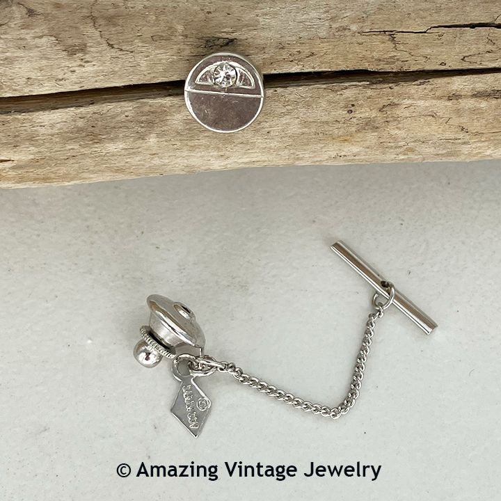 Tie Tac - Sarah Coventry. "FATHER'S TIE TAC" from 1969. Shiny and textured silver oval with 1 clear rhinestone. 9/16" long, 7/16" wide. Very good condition.