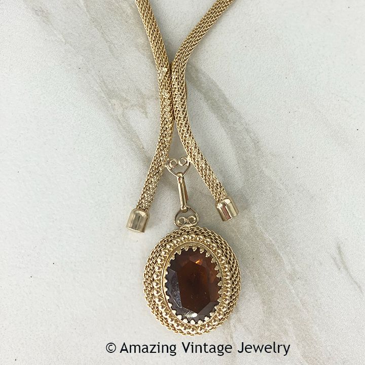 Necklace - Sarah Coventry. "FESTIVE" from 1974. Goldtone oval pendant with oval topaz rhinestone dangling from the center of the mesh chain. Pendant is about 1 5/8" long, 15/16" across. Total length of the chain is about 18" long. Very good condition.