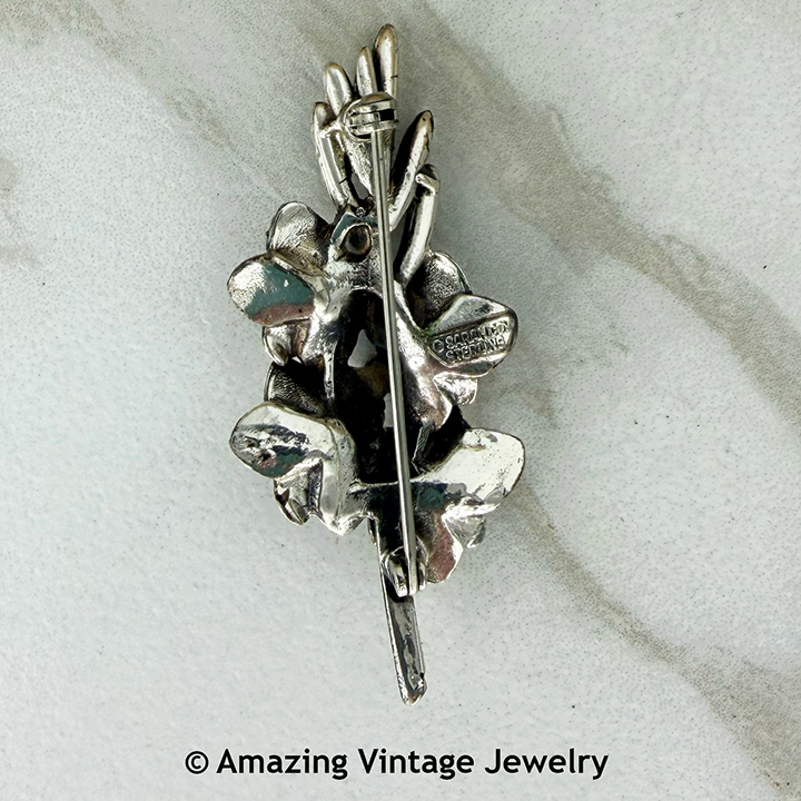 Pin - SARAH COVENTRY. "FLOWER OF THE MONTH" from the1968 LADY COVENTRY line. February - Violets. Sterling silver, beautifully detailed flower. About 2 1/8" long, 7/8" across. Very good condition. Relatively rare.