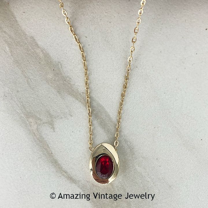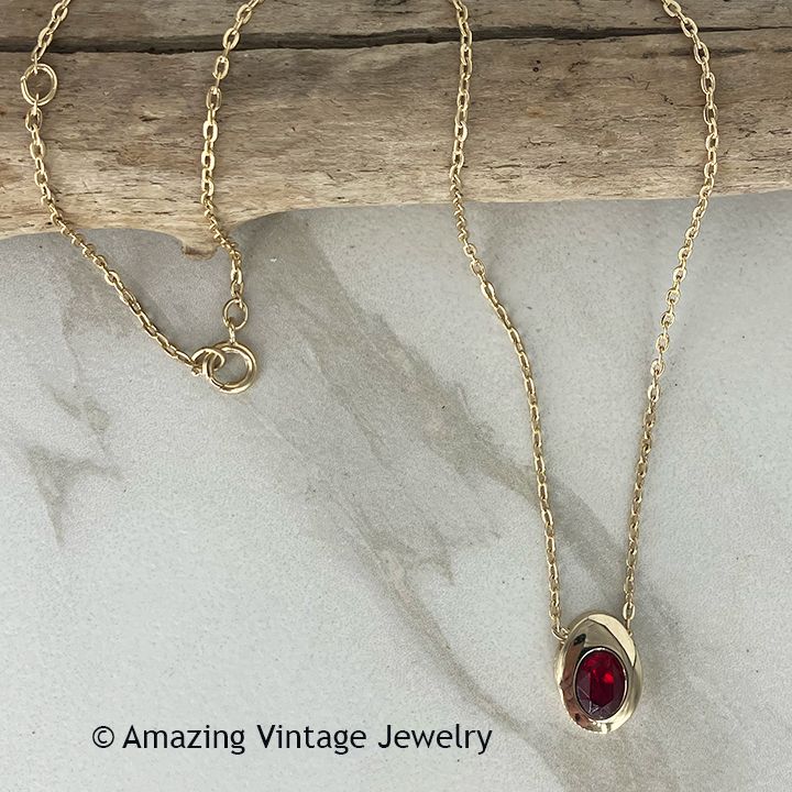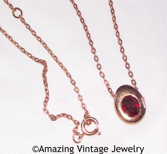 Necklace - Sarah Coventry. "FOREVER YOURS" birthstone pendant from 1978. Small, shiny goldtone pendant with faceted red stone, representing a ruby for July birthday. Pendant is 5/6" long, 7/16" across. Chain is adjustable to 16" and 18" long. Very good condition.