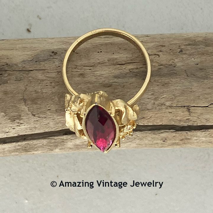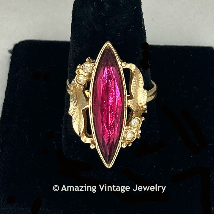 Ring - Sarah Coventry. "FUCHSIA" from Canada - 1974. Large clear fuchsia/hot pink marquise shaped inset in a goldtone frame, accented with clear rhinestones. Adjustable. Ring top is 1 1/16" long, 5/8" across. Very good condition although the clear rhinestones are slightly yellowed.
