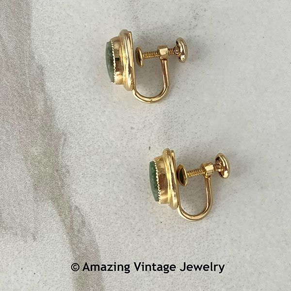 Earrings - Sarah Coventry. "JADE OVAL" from 1969. Small shiny oval goldtone frames with genuine jade insets. Screwback. Frames are dainty - 7/16" long, 3/8" wide. Marked SARAH COV on the back of the frame, 1/20-12kt Gold Filled on the knob of the screwback. Excellent condition.
