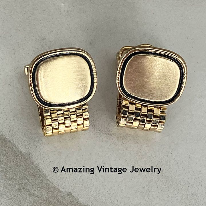 Cuff Links - Sarah Coventry. "KENTUCKY DERBY" in goldtone from 1971. Brushed goldtone ovals with black trim. These are convertible - wear with the mesh loops or remove them and wear the ovals alone. 3/4" across, 5/8" tall. Very good condition.