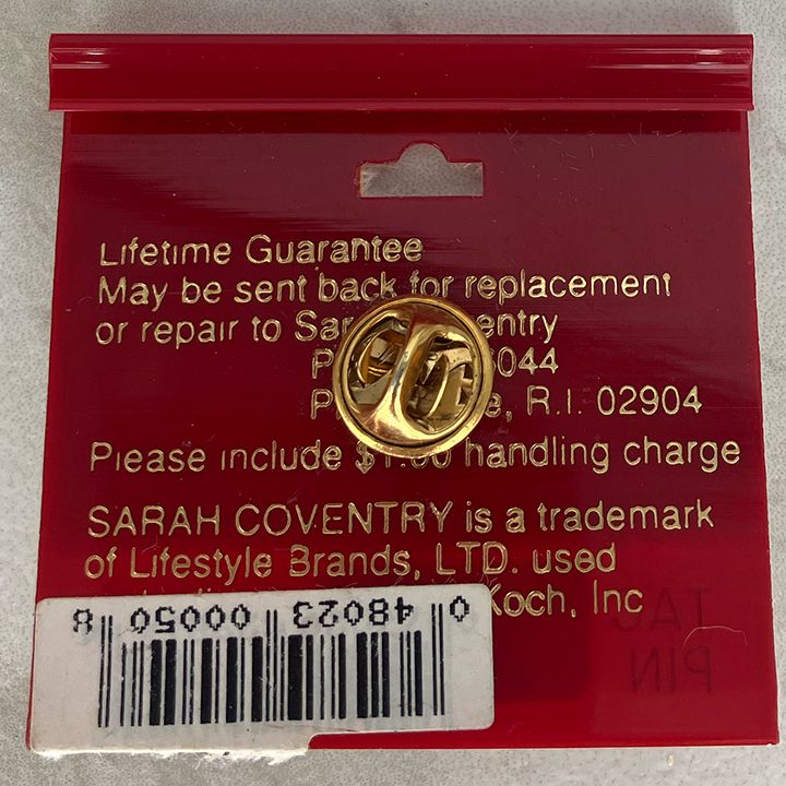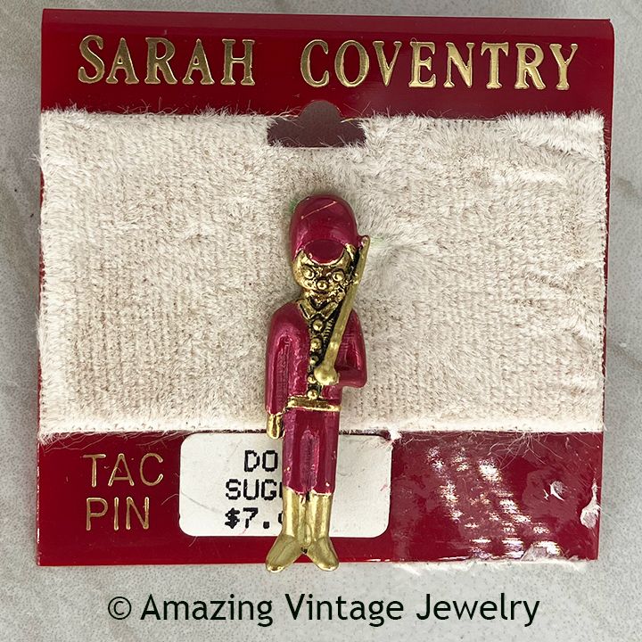 Tac Pin - Sarah Coventry by Lifestyle Brands from around the mid 1980's. Antique goldtone and enamel nutcracker/soldier tac pin. On original card, never worn. 1 5/16" tall, 3/8" across. Very good condition.