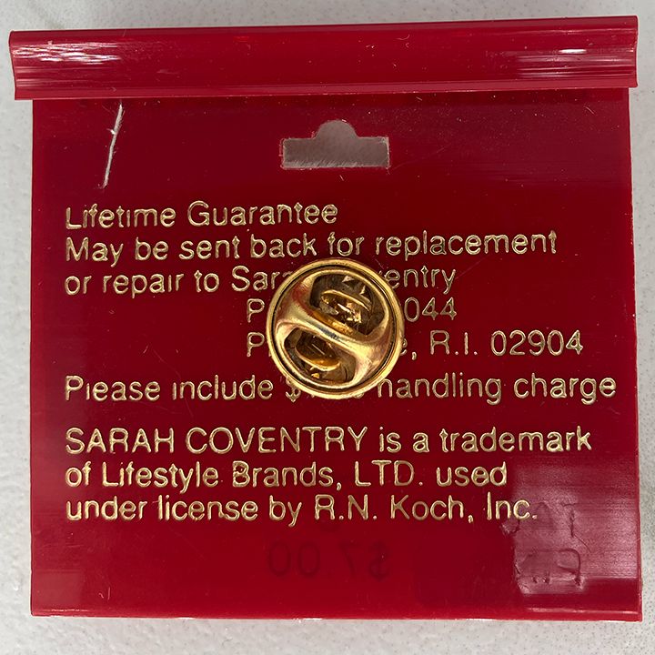 Tac Pin - Sarah Coventry by Lifestyle Brands from around the mid 1980's. Antique goldtone and enamel drum pin. On original card, never worn. 1 1/16" across, 1" across. Very good condition. The rocker has enamel on each side and goldtone in the center - I think it was meant to be that way, as it does not look like the enameling has chipped off.
