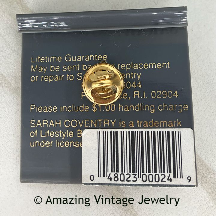 Tac Pin - Sarah Coventry by Lifestyle Brands from around the mid 1980's. Shiny goldtone tree with red rhinestone apples or cherries. On original card, never worn. 7/8" tall, 3/4" across. Very good condition.