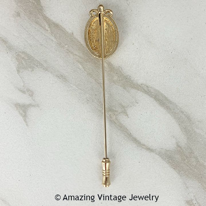 Stickpin - Sarah Coventry "MASTERPIECE" from 1972. In a classic design, this goldtone frame with the Mona Lisa replica in the center, with a faux pearl at the top, is destined to become a masterpiece all its own. Very good condition.