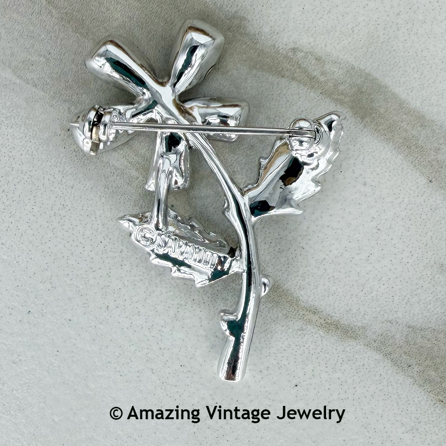 Pin - Sarah Coventry. "MINI-FLEUR" from 1968. Mini silvertone flower with Aurora Borealis accents on the petals add just a bit of sparkle to your look. 1 5/8" long, 1 1/4" across. Very good condition.