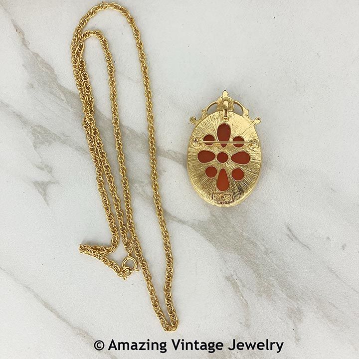 Necklace/Pin - Sarah Coventry. Very large goldtone frame with orange cameo inset. This can be worn as shown, as a pendant on a chain or wear just as a pin. Pendant is about 2" long, 1 1/4" across. Chain is 24" long. Marked SC on the back of the pendant. Probably from the 1990's.