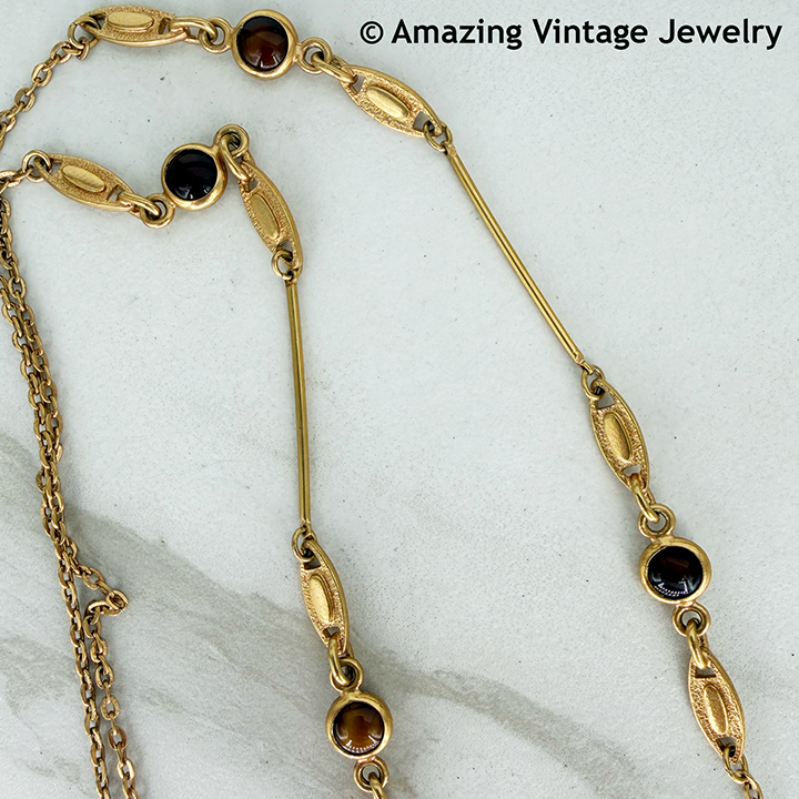 Necklace - Sarah Coventry. "PREMIER" from 1977. Pretty and delicate goldtone links with tiger eye look insets encased in goldtone. 36" long. Very good condition.