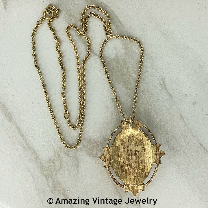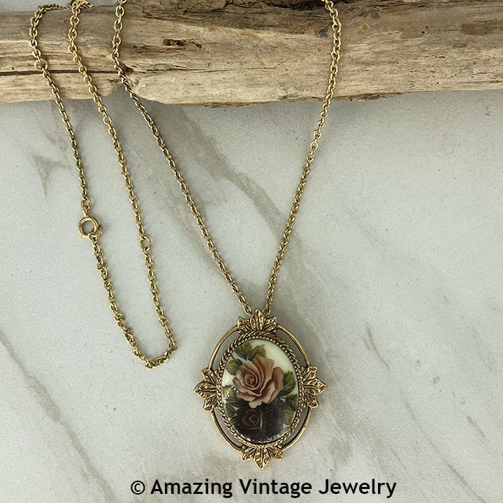 Necklace - Sarah Coventry. "ROSE MARIE" from 1977. An authentic antique-look goldtone frame with a cream ceramic inset of 2 roses that brings back memories of days gone by. Pendant is 1 7/8" long, 1 5/8" across. Chain is adjustable to 19 1/2" and 23 1/2" long. Very good condition.