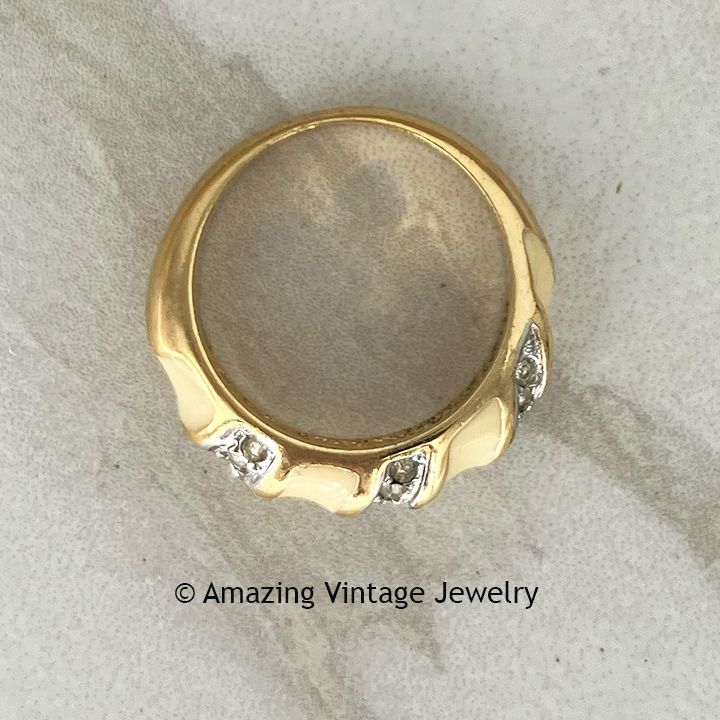 Ring - Sarah Coventry. "RUNWAY" from 1984. Goldtone band with alternating cream epoxy enamel and rhinestones. Size 7 1/2 - not adjustable. Marked SC. Very good condition although some of the stones are slightly yellowed.