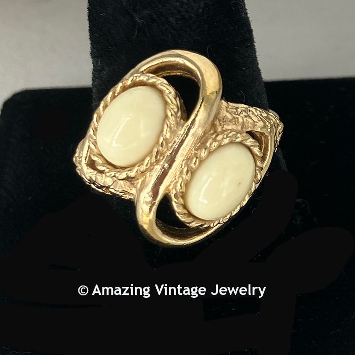 Ring - Sarah Coventry. "SATIN SAND" from 1974. Understated elegance in goldtone swirls with 2 almond-colored insets. Ring top is 3/4" long and wide. Adjustable. Very good condition.