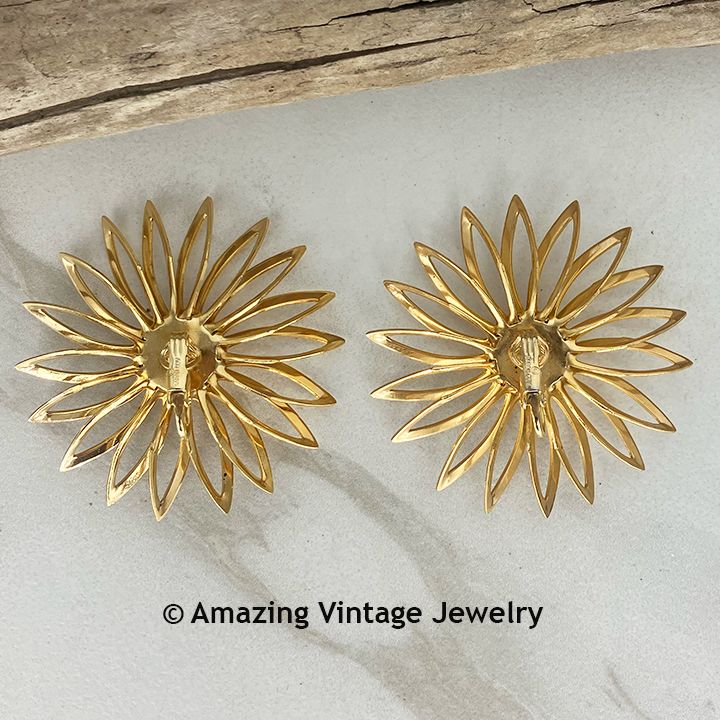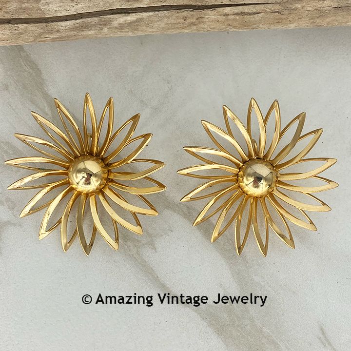 Earrings - Sarah Coventry. "SAUCY" from 1961. Huge open goldtone flowers - these definitely make a statement! 2 1/8" in diameter. Very good condition.