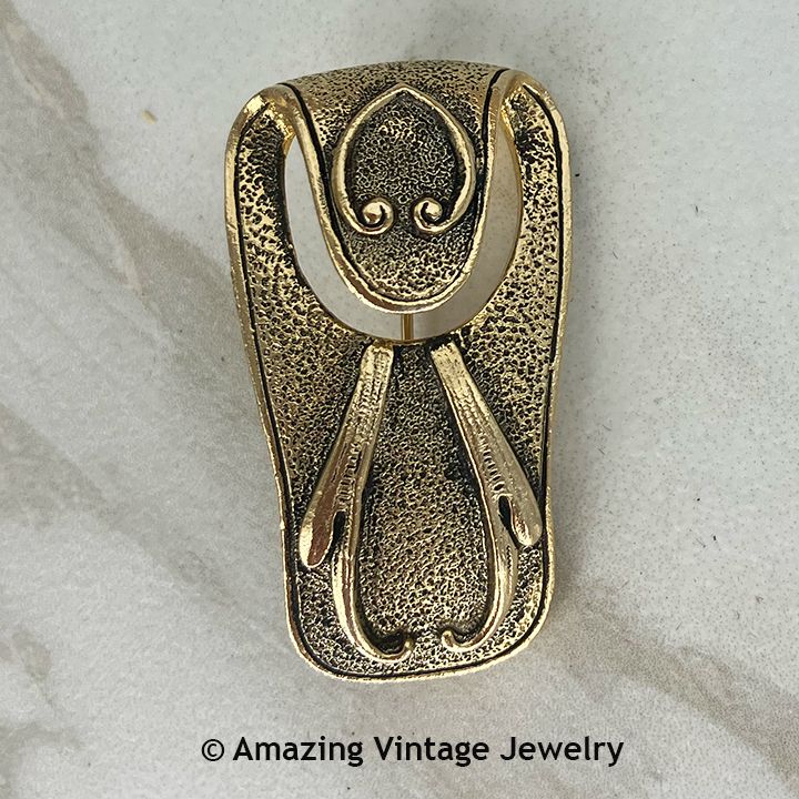 Pin - Sarah Coventry. "SPLIT-TRICK" from 1973. An antique-look goldtone abstract pin that I understand is meant to be a purse strap hook worn on your coat shoulder. Just pin it on vertically with the hook at the bottom - and hang your purse from the hook. 1 13/16" long, 1" across. Excellent condition in the original box on the original card. Never worn.