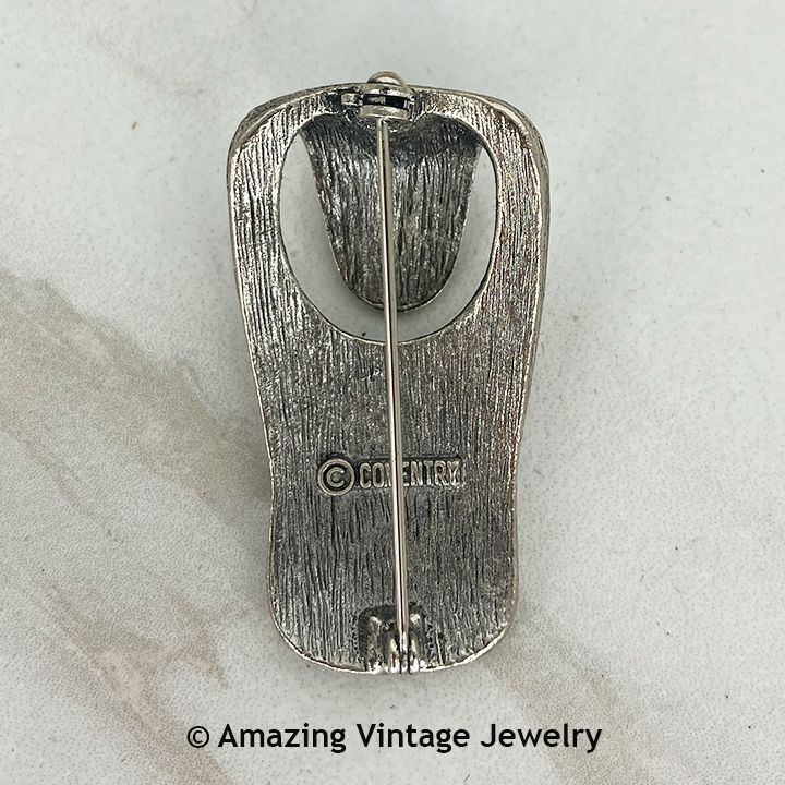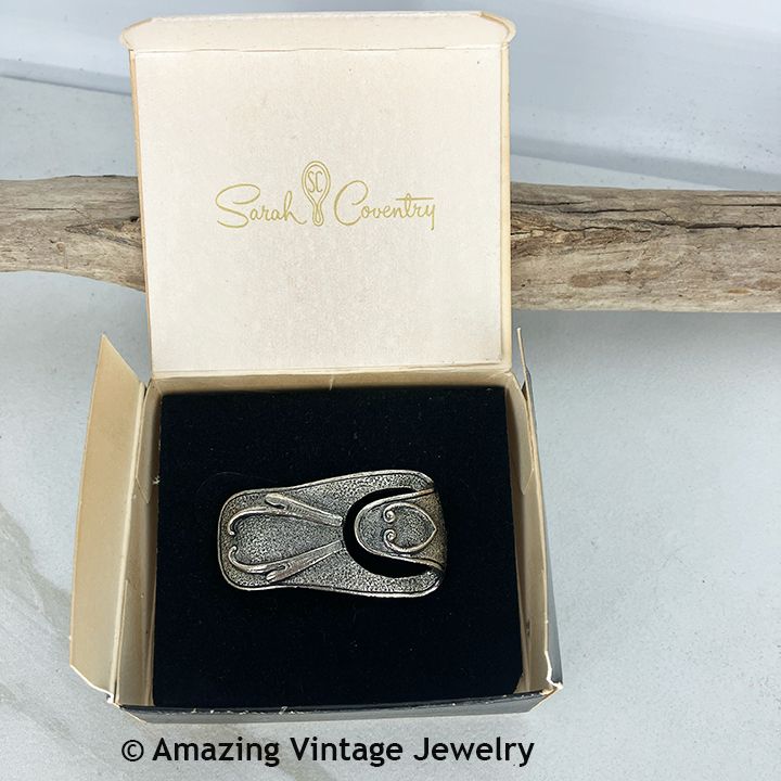 Pin - Sarah Coventry. "SPLIT-TRICK" from 1973. An antique-look silvertone abstract pin that I understand is meant to be a purse strap hook worn on your coat shoulder. Just pin it on vertically with the hook at the bottom - and hang your purse from the hook. 1 13/16" long, 1" across. Excellent condition in the original box on the original card. Never worn.