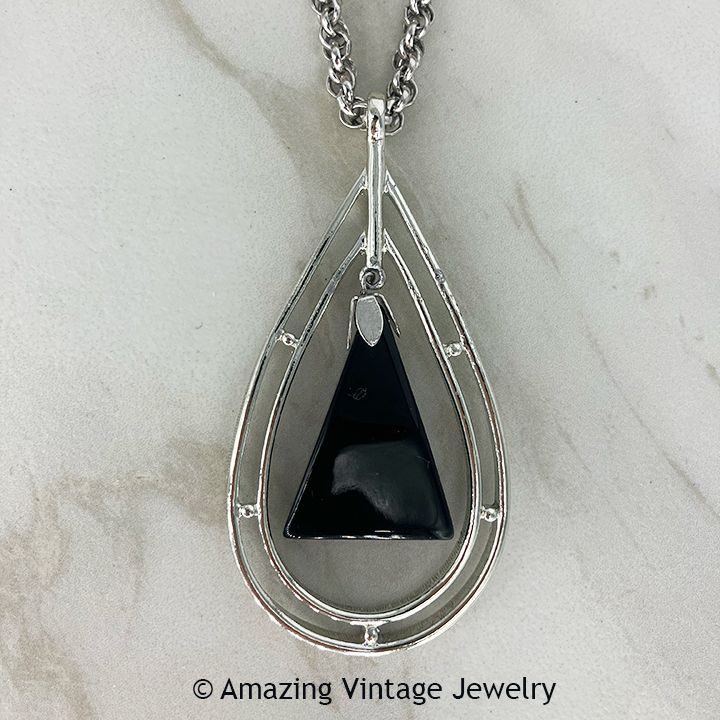 Necklace - Sarah Coventry. "STUNNING-PLUS" from 1964. Very large statement pendant with silvertone setting and swinging black triangular inset. Pendant is a whopping 3" long, 1 5/8" wide. Chain is 20" long, not adjustable. Very good vintage condition although there are some hard to see chips to the silvertone setting. Photo is the exact item you will receive.