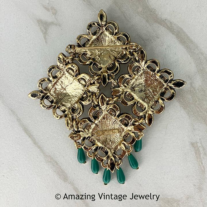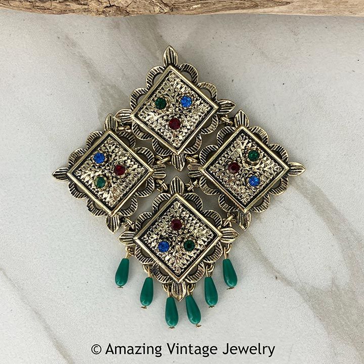 Pin - Sarah Coventry. "TEMPLE-LITES" from 1969. Textured goldtone squares, hinged together, with colorful rhinestones and green dangles at the bottom. 3 1/4" long, 3" across. Very good condition.
