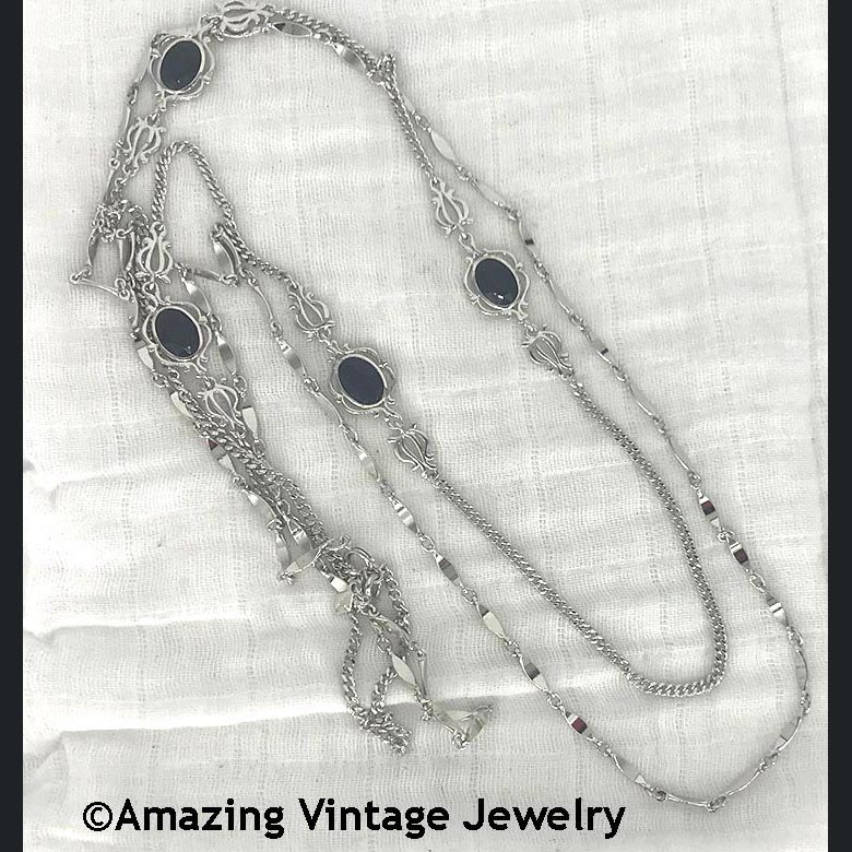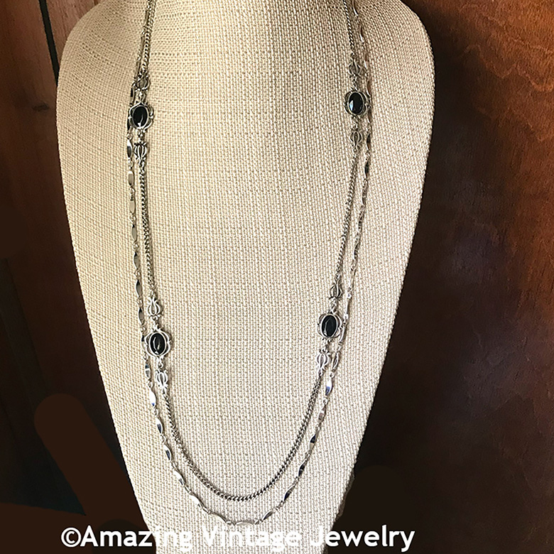 Necklace Set - Sarah Coventry. "TOUCH OF CLASS" from 1979. Bright silvertone chain with black faceted insets (37"), paired with a second silvertone chain (40")...Very eye-catching!! This necklace was originally sold as a set in 1979, but is most often found without the second silvertone chain. Very good condition with some hard to see minor discoloration on some of the silvertone links. Priced accordingly.