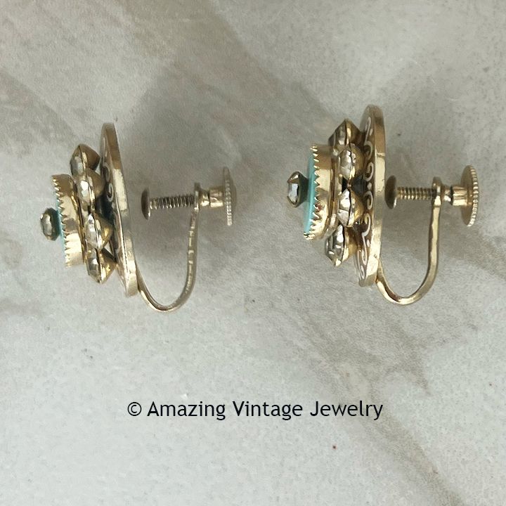 Earrings- Sarah Coventry. "TURQUOISE IN CRYSTAL" from 1949. Pretty oval goldtone disks with white etched design layered with a turquoise disk featuring a center clear rhinestone and surrounded by clear rhinestones. Screwback. 3/4" long, 5/8" across. Very good overall condition although some of the the rhinestones are just slightly yellowed. The photograph shows these on a black card which I used to position the earrings and show their detailing - the black card is not included.