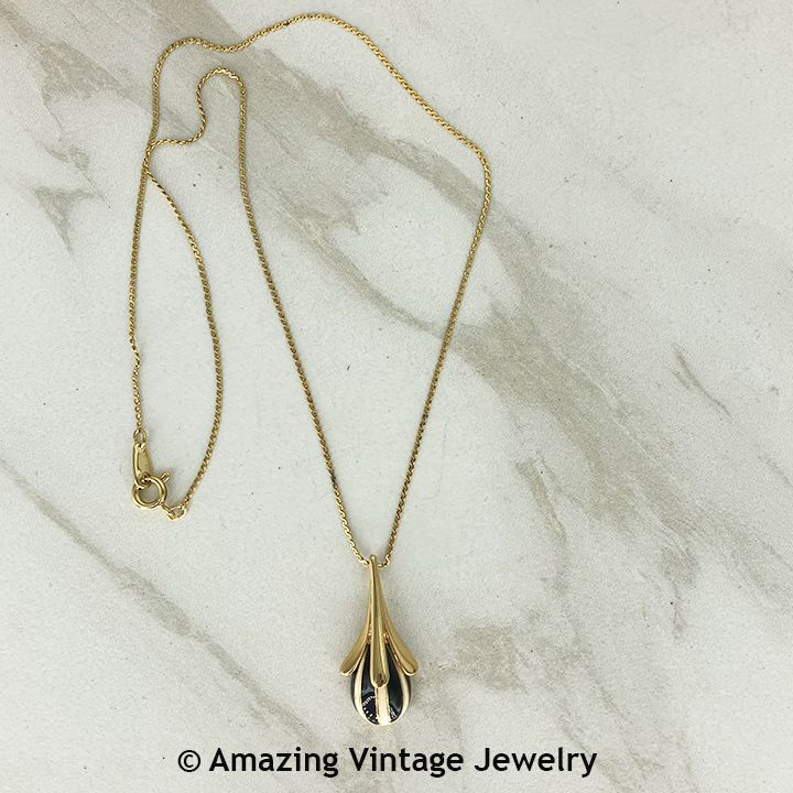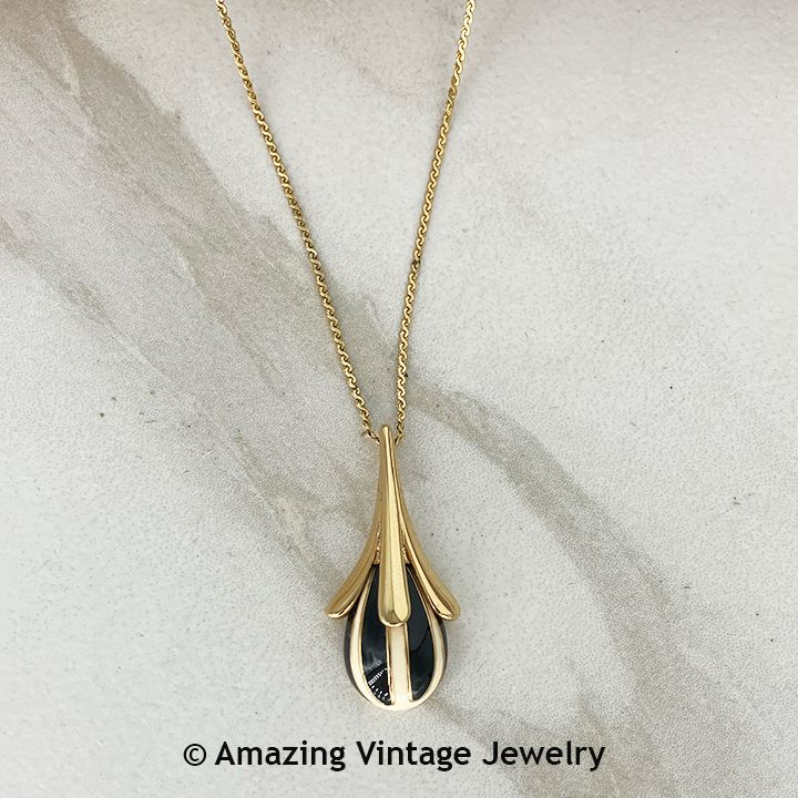 Necklace - Sarah Coventry. Small goldtone upside down flower pendant with oval cream and black enamel egg-shape center. Pendant is 1 1/8" long, 17/32" across. Fine gold plated chain is 16" long. Excellent condition. Relatively rare item.